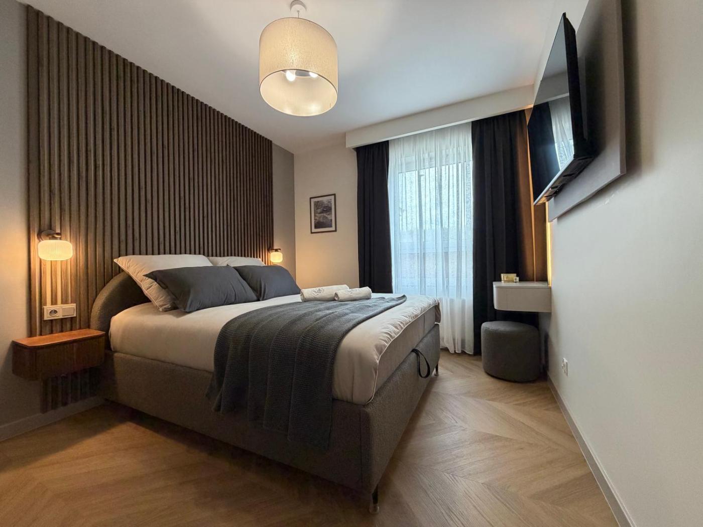 Apartament z 2 sypialniami. In the fully equipped kitchen, guests will find a stovetop, a refrigerator, a dishwasher and kitchenware. This apartment is air-conditioned and has a seating area with a flat-screen TV, a washing machine, a tea and coffee maker, a dining area, as well as a wardrobe. The unit has 3 beds. Apartament - 6 osobowy. Powierzchnia pokoju ok.: 48 mkw.